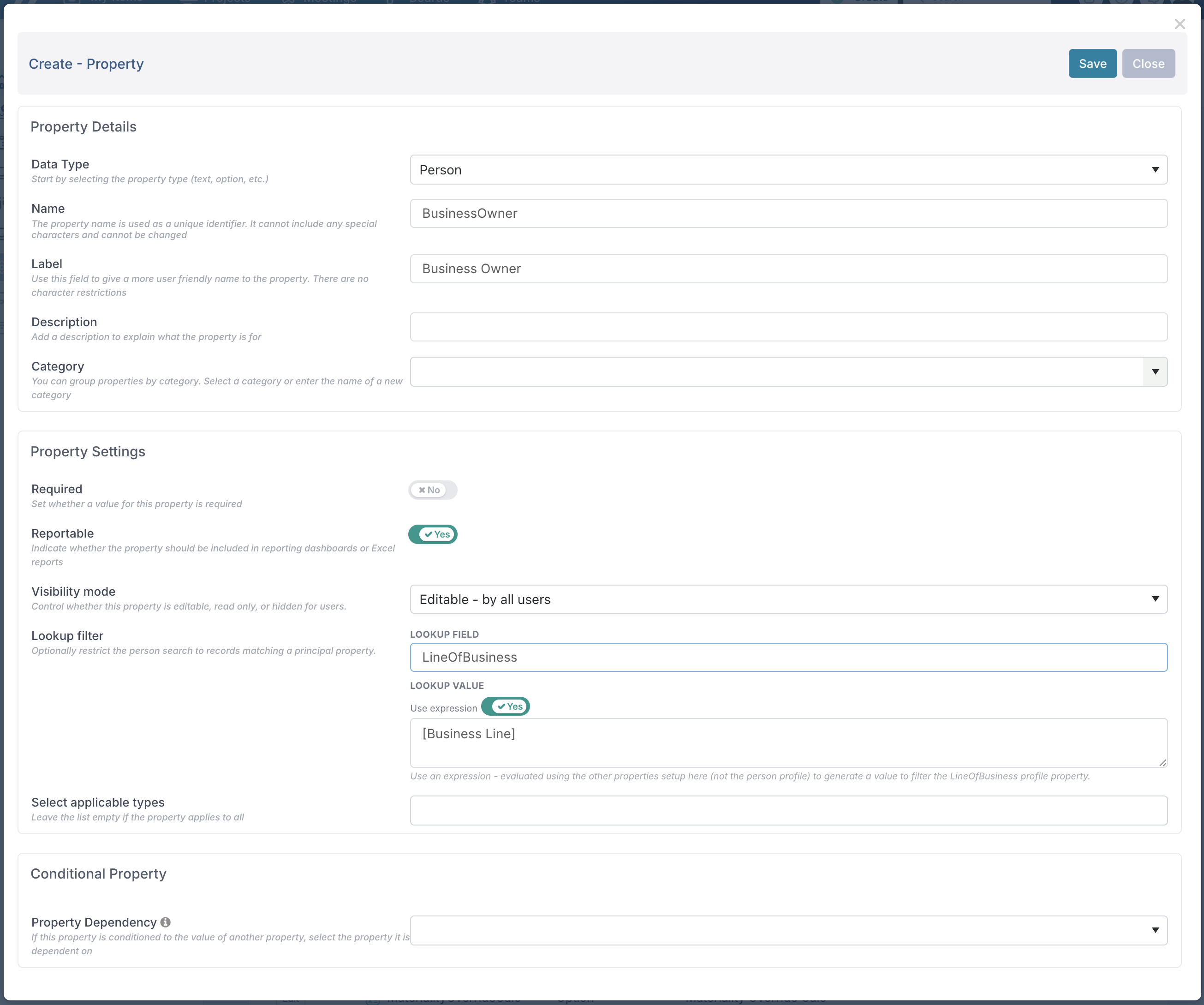 The Lookup Value uses an expression that references another property on the item, in this example the project’s Business Line.