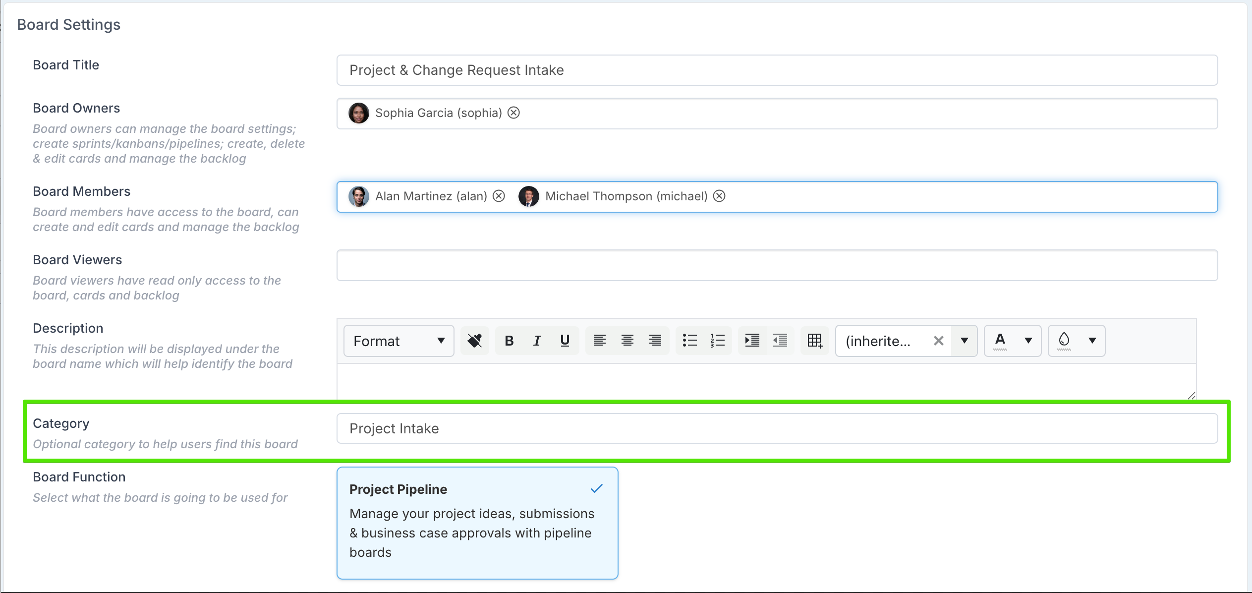 For boards that remain visible, you can now also assign them to categories. Categories are shown to requesters when browsing available work request boards and help guide users to the right intake path, such as Project Intake, Change Requests, Operational Work, or Governance Reviews.