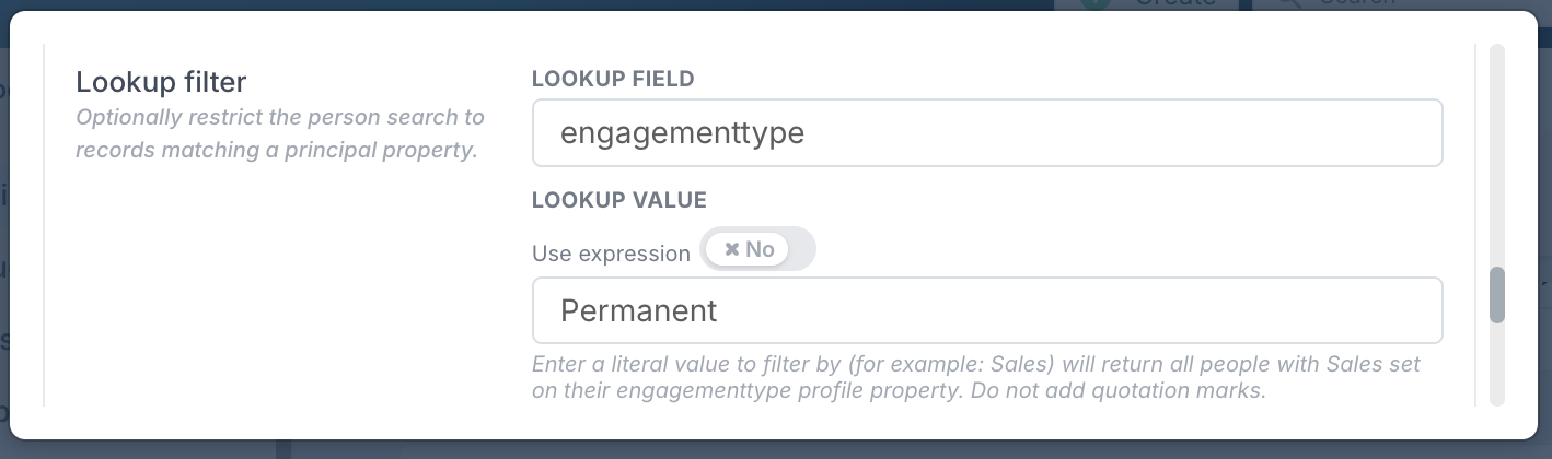 When creating Custom Properties that look up values from a Person or Resource record, it is essential to use the correct field keys. Lookup expressions rely on internal, code‑level keys, not the friendly labels shown in the UI. Using an incorrect field name will cause your lookup to fail or return empty results.