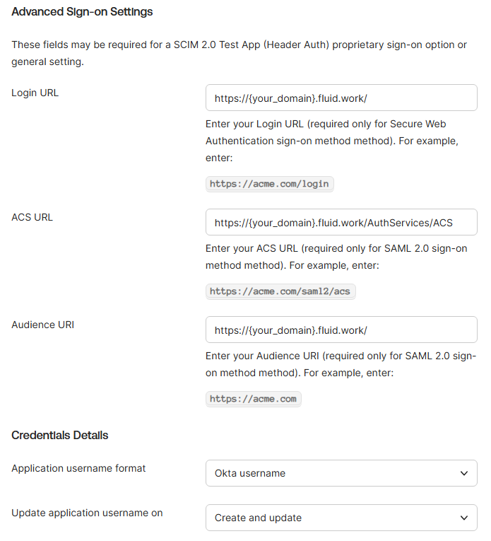 The instructions will link Okta with your Fluid instance. This will authenticate your Fluid logins against Okta. They however will also work with SAML services such as Google Workspaces and Ping.