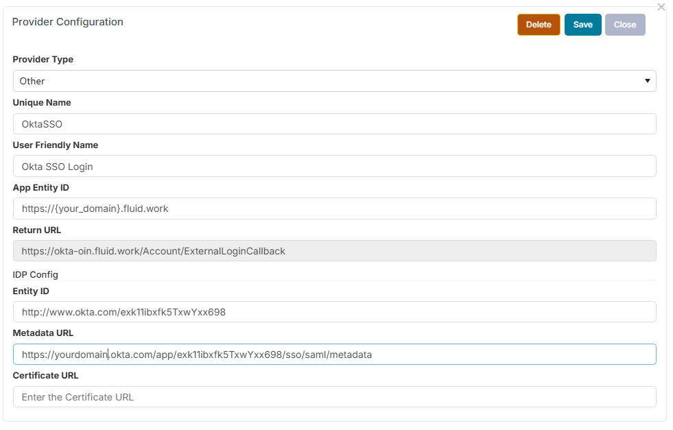Type a friendly name such as “Okta SSO” in the Name field. This is seen by your end users on the Fluid Login Page.